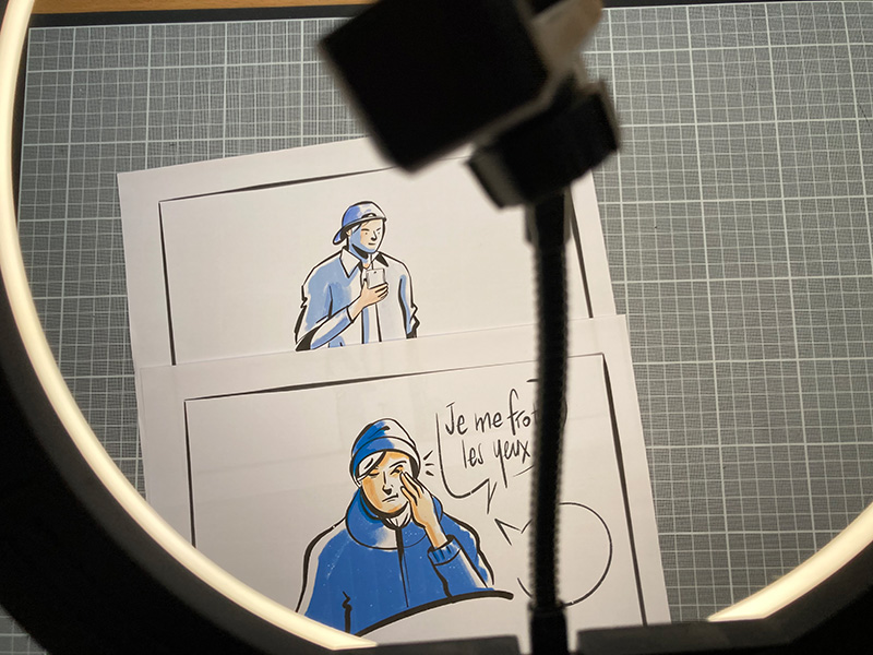 Sur la base de la rédaction du story board et de l’enregistrement de la voix off, les illustrations ont été réalisées et la manipulation, filmée et montée pour correspondre à la voix off.